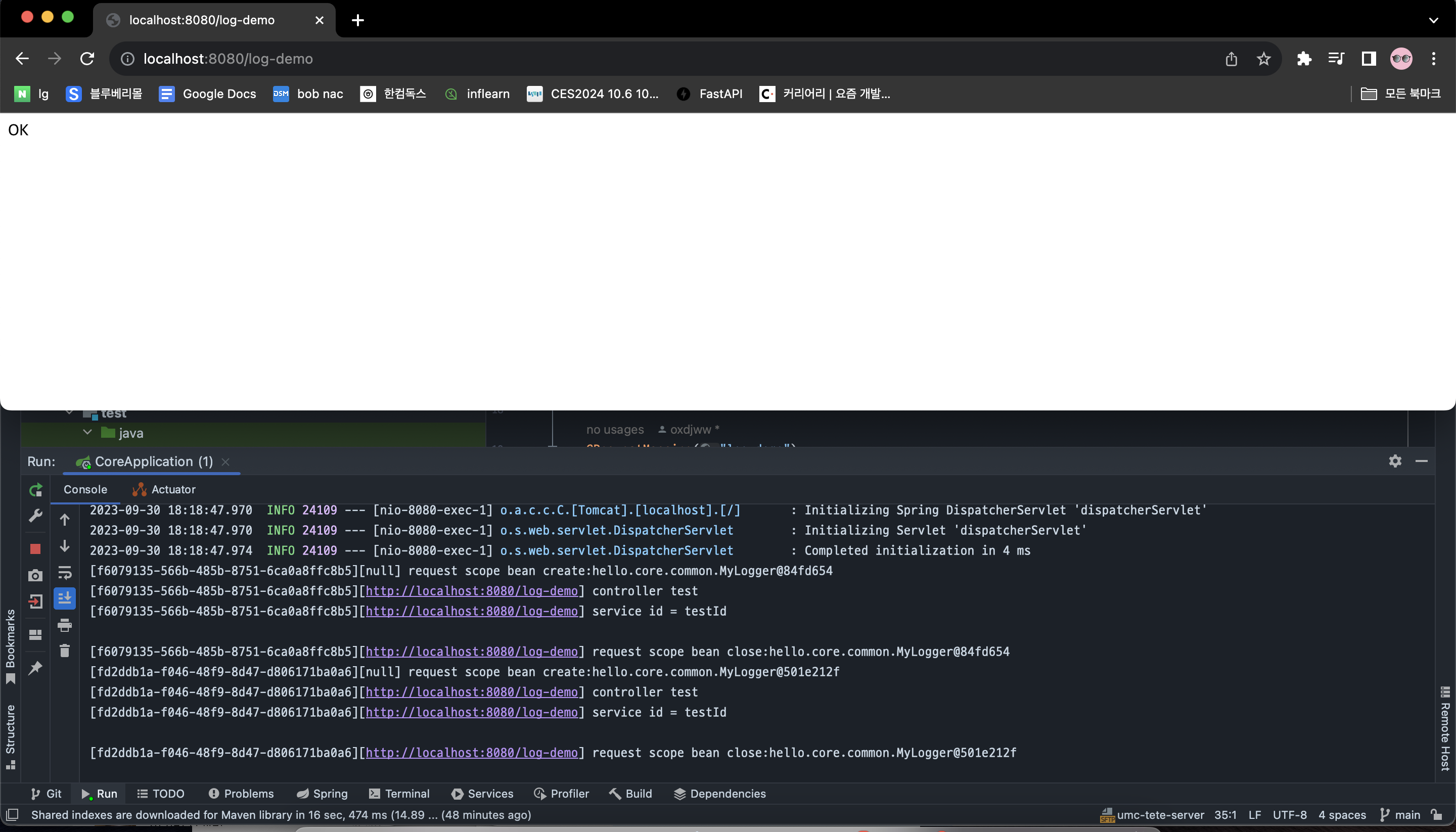 [d06b992f...] request scope bean closehttp 요청이 들어오면 이런 로그가 남도록 test를 작성해볼 것이다.
