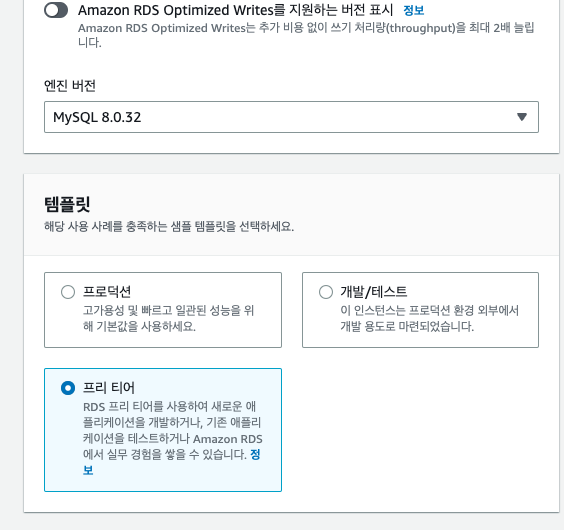 EC2에 설치된 MySQL version과 일치하는 version을 선택 후 프리티어로 선택해준다