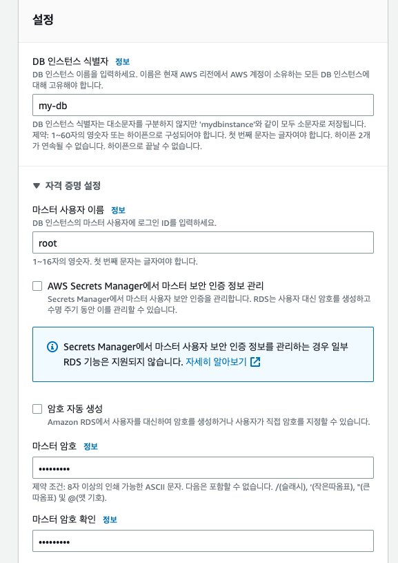 원하는 DB 인스턴스 이름, 마스터 사용자 이름, 암호를 입력해준다