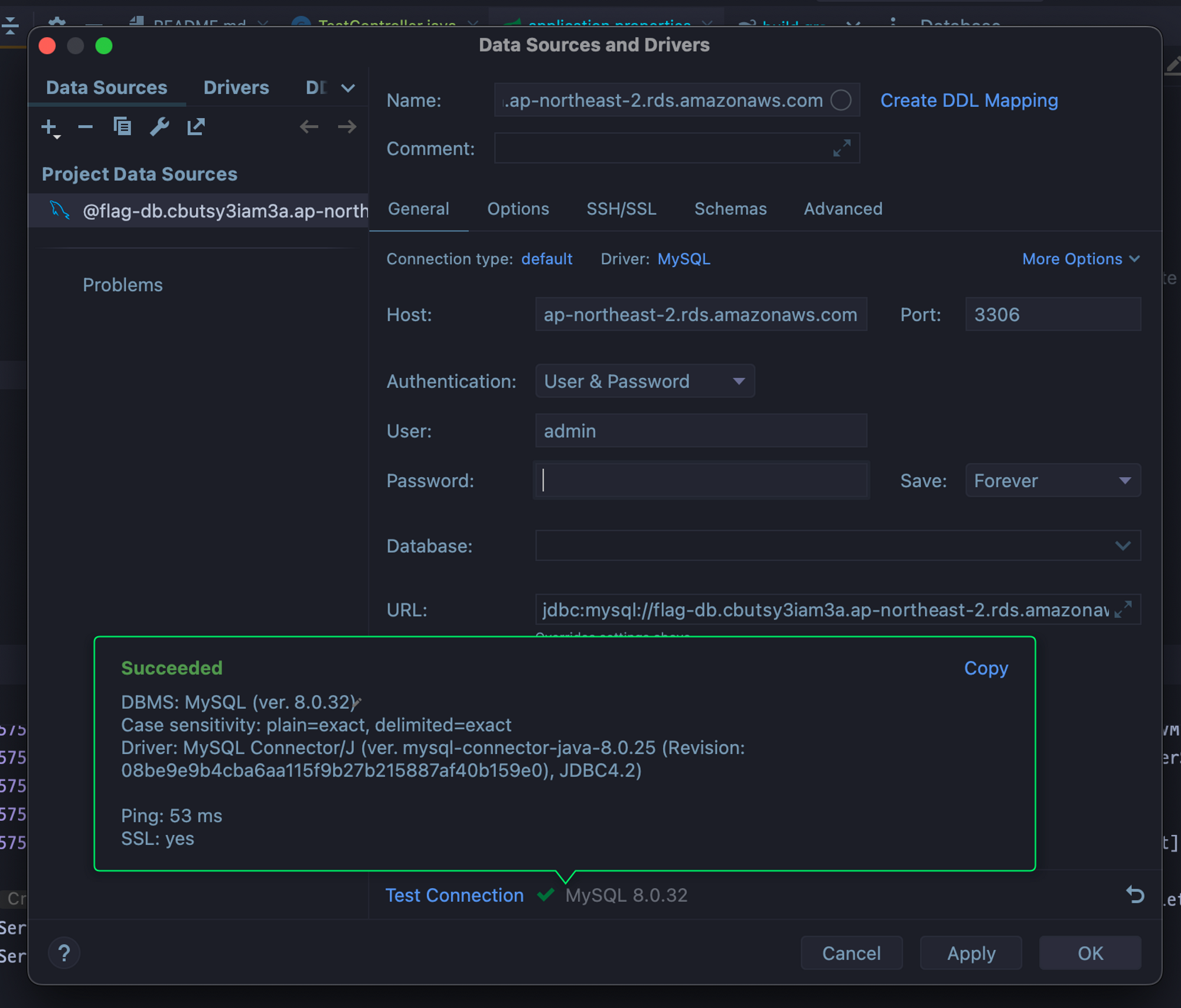 그리고 AWS RDS를 생성하고, DataGrip 툴을 사용하여 연동하였습니다.